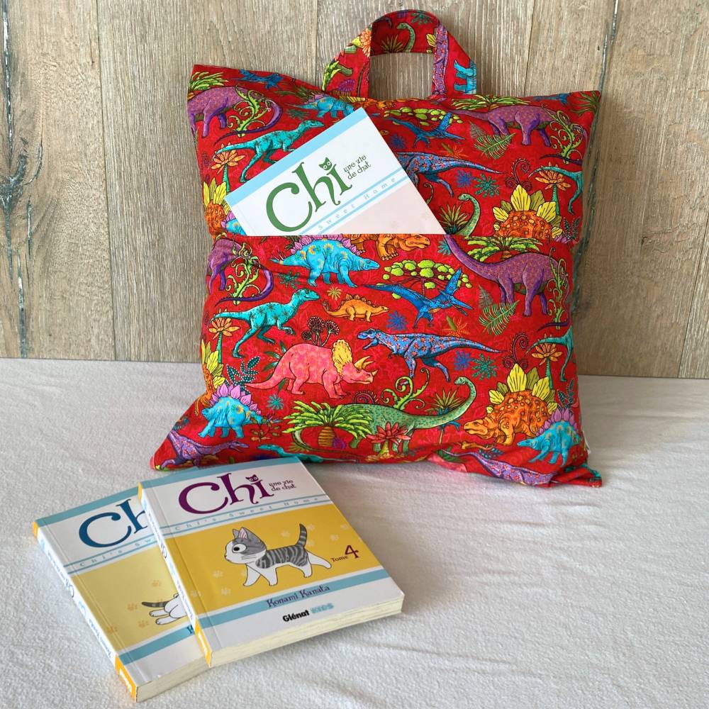 La housse possède une pochette intégrée pour ranger votre livre ou vos accessoires, et une poignée pratique pour la transporter facilement. Vous pouvez commander la housse seule, ou ajouter le coussin intérieur optionnel pour un ensemble complet prêt à lire et à décorer !