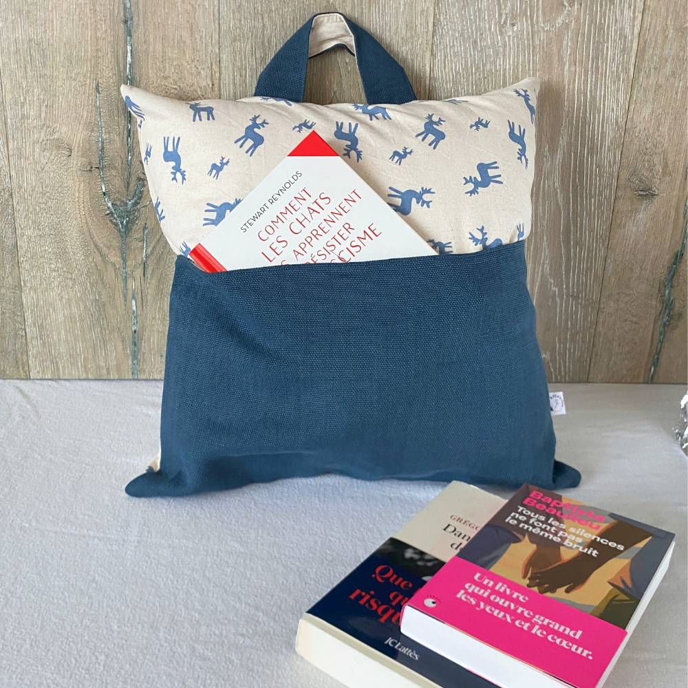 La housse possède une pochette intégrée pour ranger votre livre ou vos accessoires, et une poignée pratique pour la transporter facilement. Vous pouvez commander la housse seule, ou ajouter le coussin intérieur optionnel pour un ensemble complet prêt à lire et à décorer !