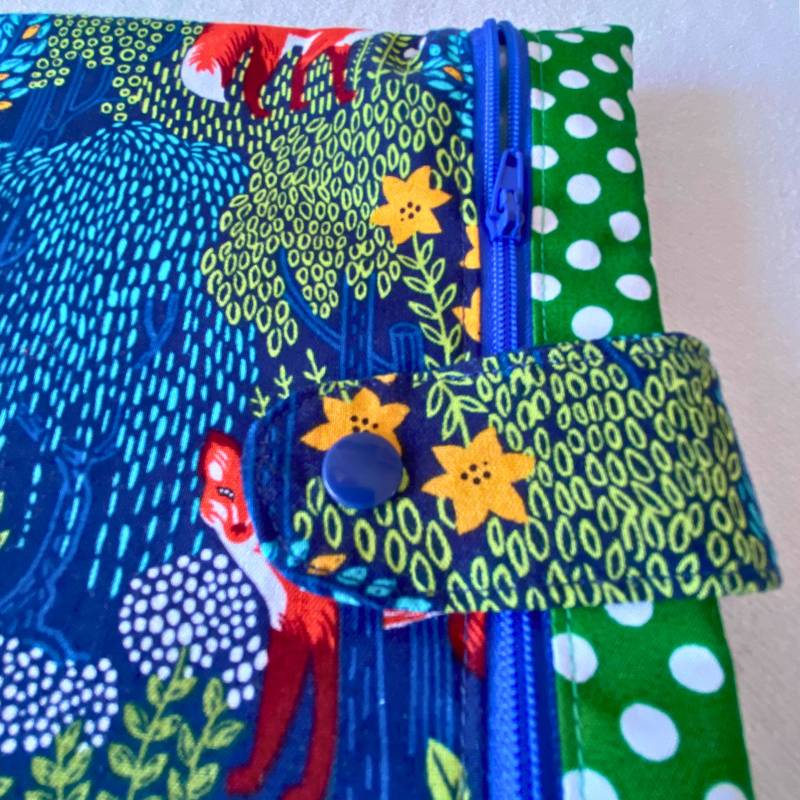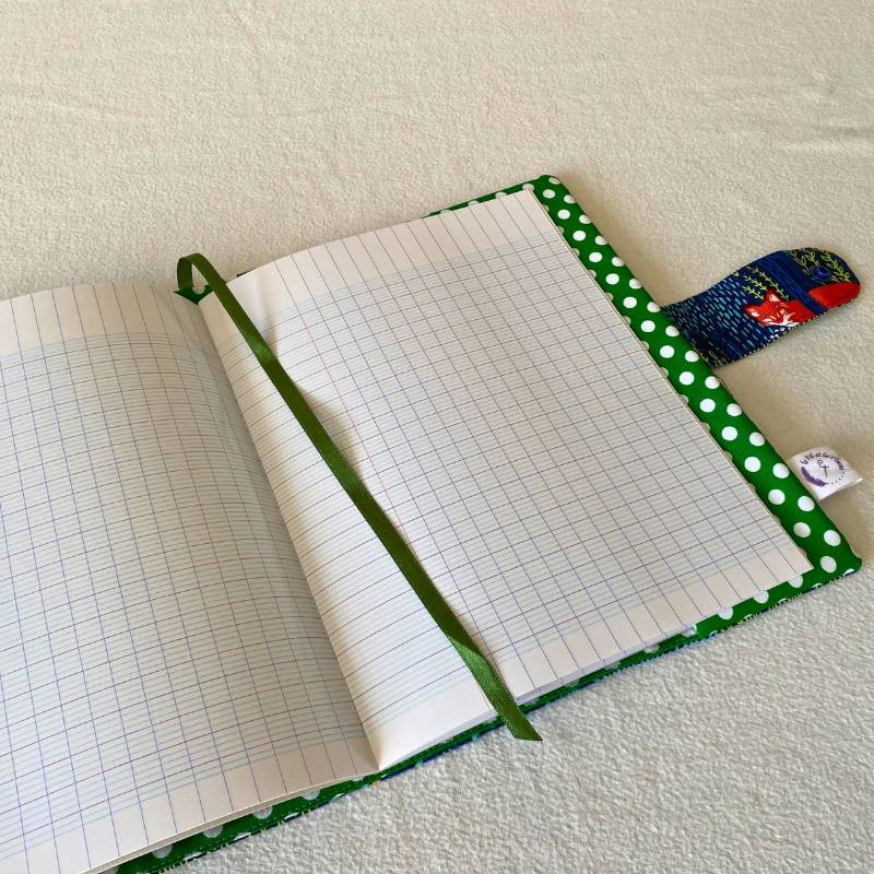 C’est pour ça que j’ai cousu ce protège-cahier avec un marque-page intégré et une petite trousse, pour ranger stylos, crayons, surligneurs… ou même vos trésors secrets 😏